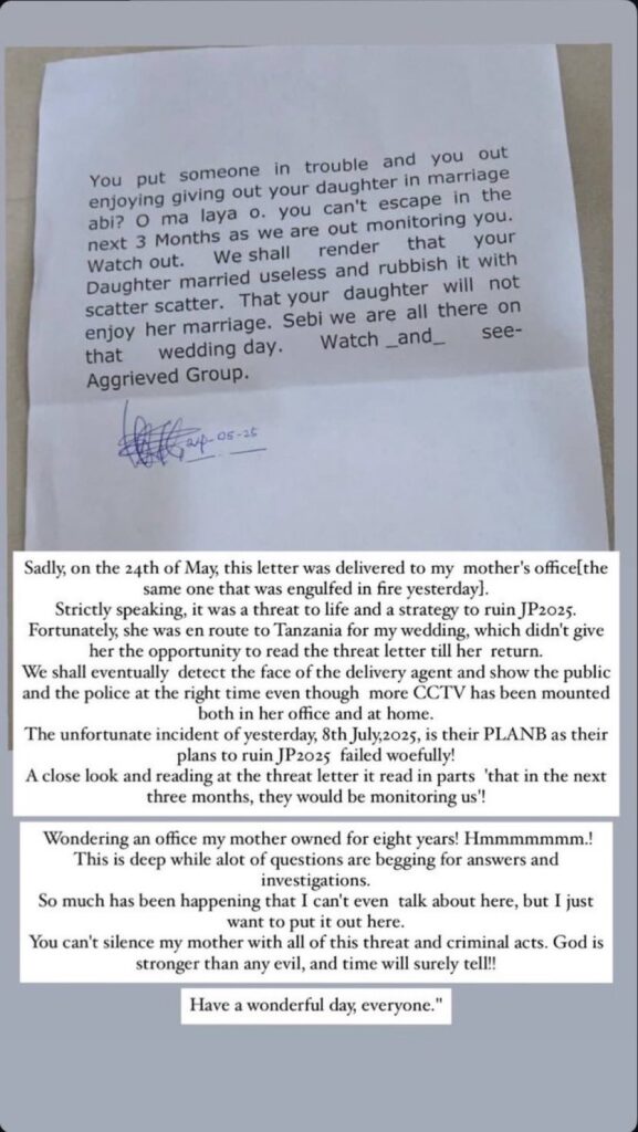 Adding to the controversy, Iyabo Ojo’s daughter, Priscilla Ojo, took to social media to reveal a disturbing letter her mother had received before her wedding in May.